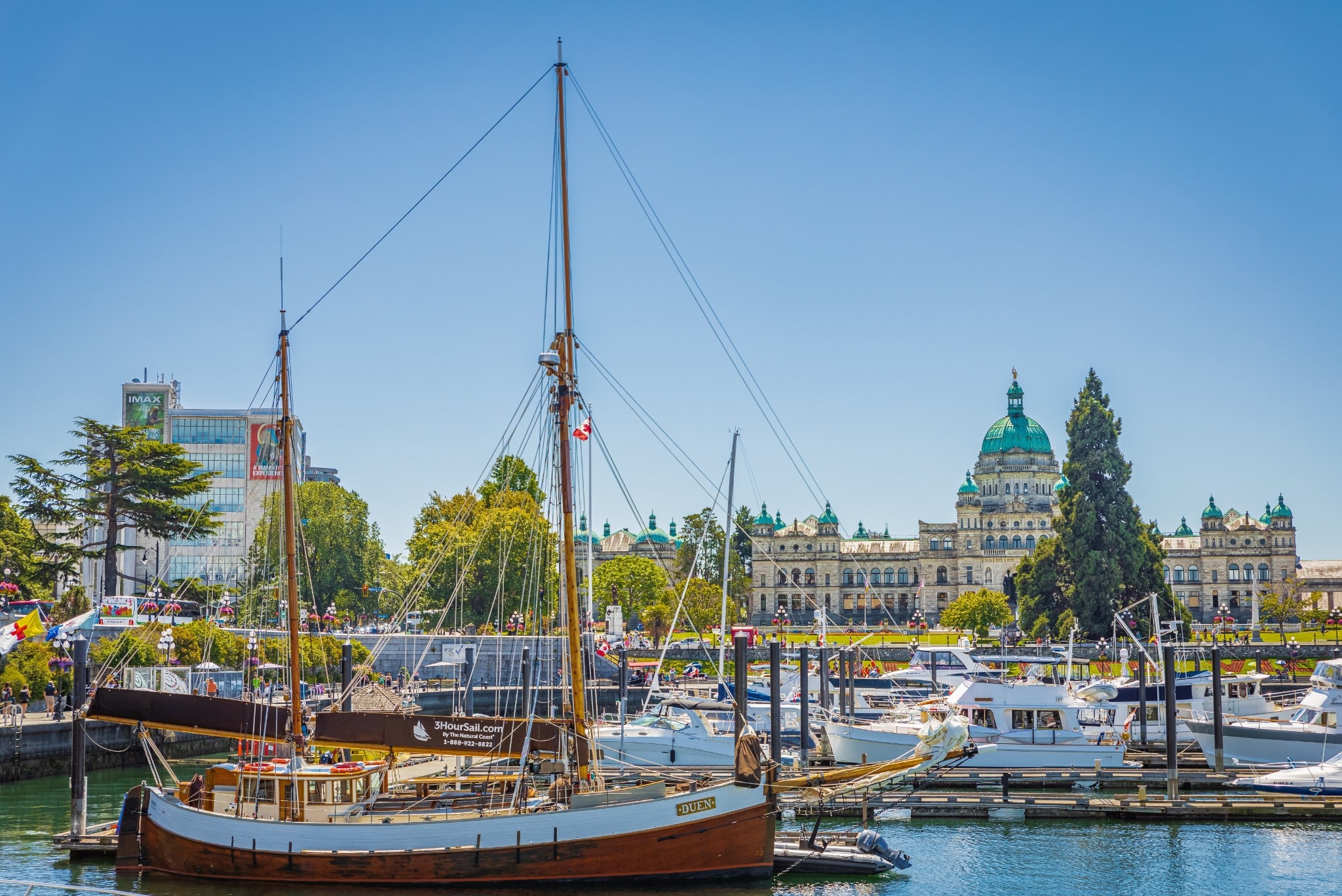 Je kunt een eerste wandeling maken langs de Inner Harbour, waar het parlementsgebouw en het Fairmont Empress Hotel het beeld bepalen. Terrassen liggen hier direct aan het water, wat deze plek prettig maakt om de dag af te sluiten.