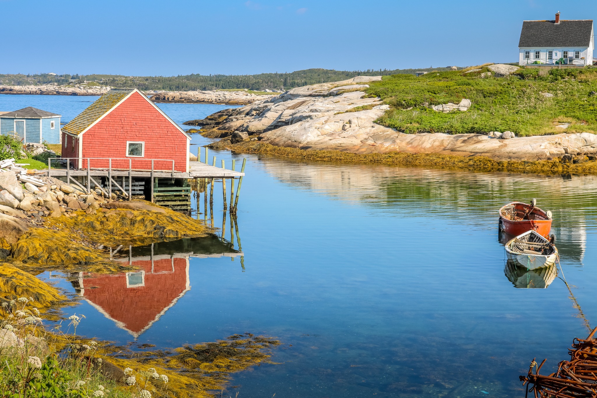 In Nova Scotia ligt Peggy’s Cove, een kleine vissersgemeenschap met een vuurtoren op granieten rotsen. Je loopt hier over gladde stenen terwijl de golven tegen de kust slaan. Vissersboten liggen in de haven en in het dorpje vind je eenvoudige cafés met uitzicht op zee.