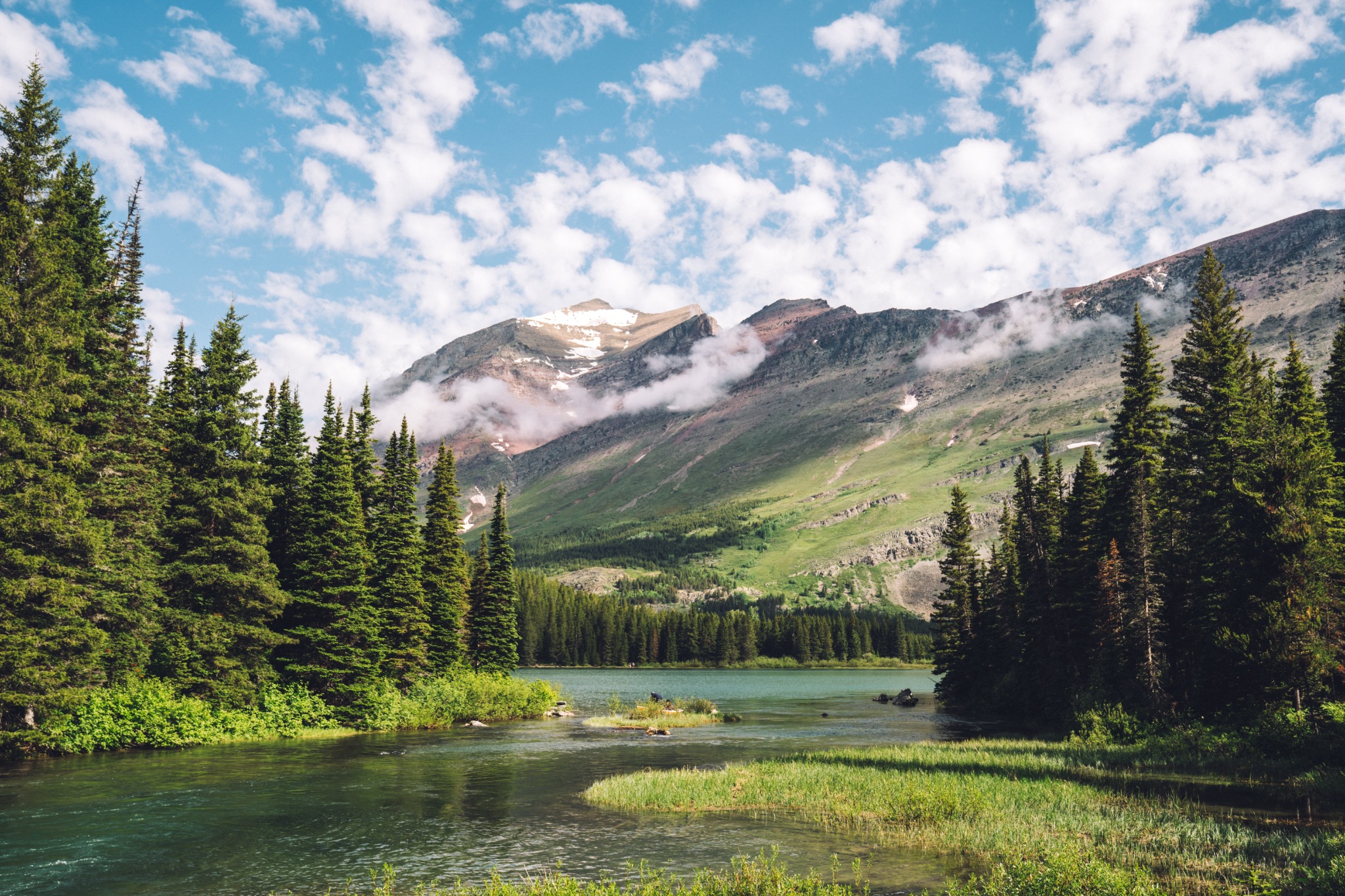De natuur in Glacier National Park wordt sterk bepaald door hoogte en klimaat. In de lagere delen groeien dichte bossen van hemlock, zilverspar en ceder. Hier hoor je vooral stromend water en vogels. Naarmate je hoger komt, maken de bossen plaats voor open alpenweiden en rotsachtige hellingen, waar de vegetatie schaars wordt.