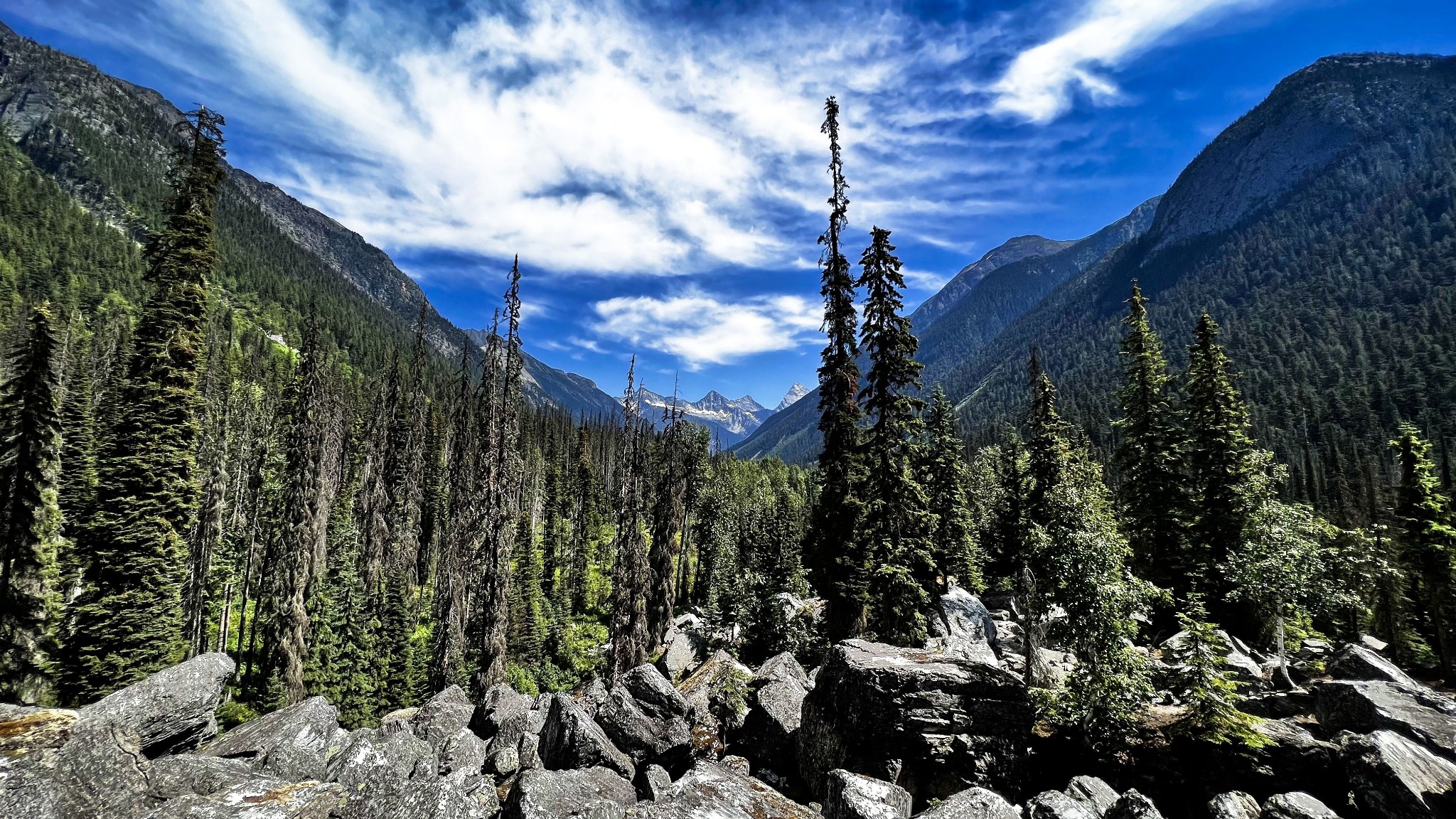 Wat Glacier National Park onderscheidt van andere nationale parken is de relatieve rust. Zelfs in de zomermaanden zijn er plekken waar je urenlang wandelt zonder iemand tegen te komen. Een goed voorbeeld hiervan is de omgeving rond Illecillewaet Valley. Hier volg je oude paden die ooit door alpinisten en spoorwegarbeiders werden gebruikt. De vallei voelt afgesloten en intiem, met steile wanden aan beide zijden en zicht op hangende gletsjers.