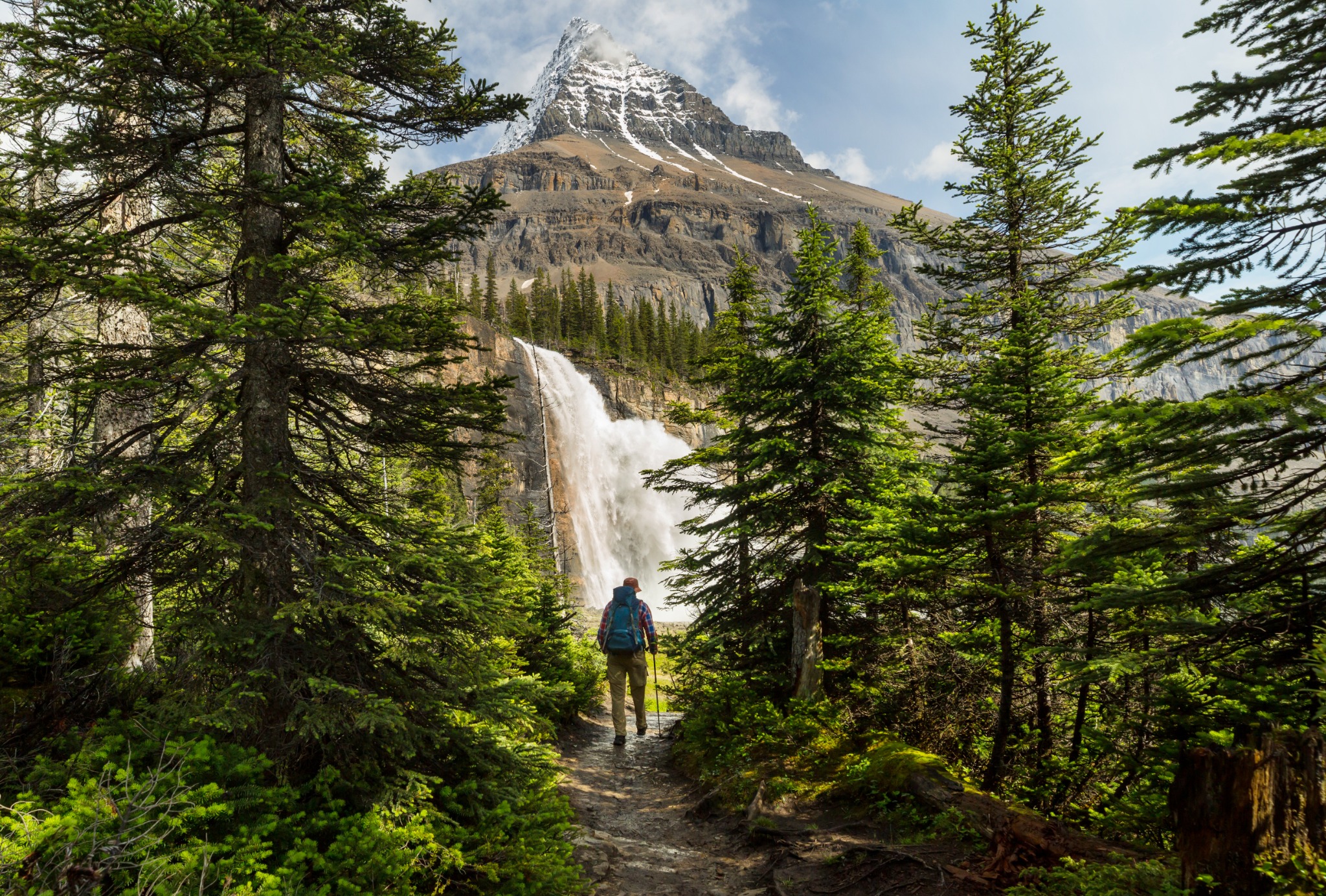 Juni markeert het begin van het seizoen. De lagere wandelingen zijn goed begaanbaar en de rivieren voeren veel smeltwater. Watervallen zijn in deze periode op hun krachtigst. Hogere delen van routes zoals het Berg Lake Trail kunnen begin juni nog sneeuwvelden hebben. Temperaturen liggen overdag gemiddeld rond de 15 tot 18 graden, met frisse ochtenden.